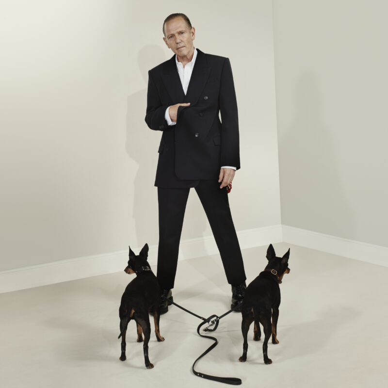 Paul Simonon, musician and artist, lends his effortless charisma to the narrative, posing with his dogs in sharply tailored suits that merge rebellion with precision. His portraits hum with a sense of ease and defiance, echoing Burton’s vision of modern British individuality.