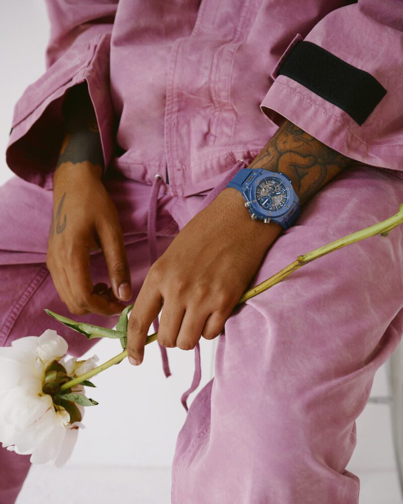 Look 3: HUBLOT Big Bang Unico Petrol Blue Ceramic watch with petrol blue skeleton dial, 42mm polished petrol blue ceramic “One-Click” System case, petrol blue ceramic bezel with six H-shaped titanium screws, UNICO movement and petrol blue lined rubber strap, Jacket and trousers ARIES, Shoes TIMBERLAND, Sunglasses OAKLEY at HOLSALES