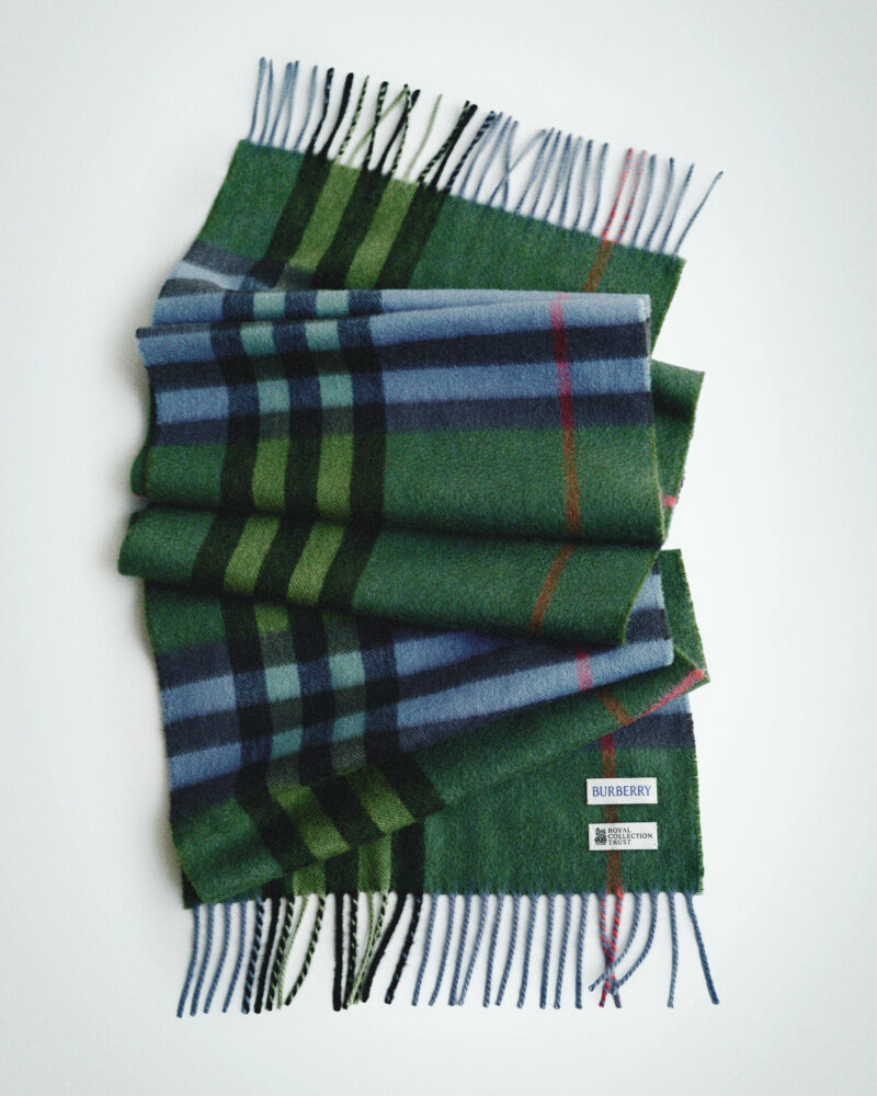 The check takes inspiration from the historic Old Stewart Tartan once worn by the Queen and appears on the coat’s silk lining, a Scottish-woven cashmere scarf, and the border of a silk twill scarf printed with a hand-painted illustration of Balmoral Castle, the Royal Family’s Highland retreat.