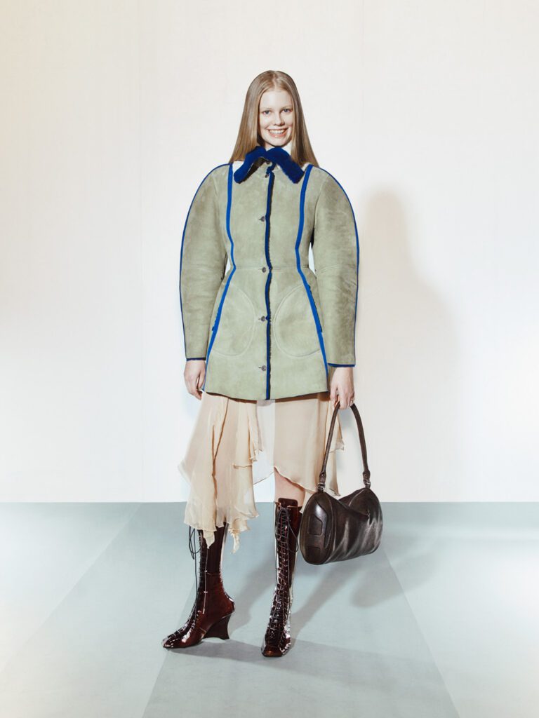 Patent leather zip-up jackets introduce cocoon sleeves, a silhouette carried over from the recently shown SS26 collection. Heritage Diesel topstitching adds detail, while a matching below-the-knee skirt plays with a trompe l’oeil low waist defined by a wide belt. Elsewhere, mesh tops and skirts are double layered to soften and blur transparency.