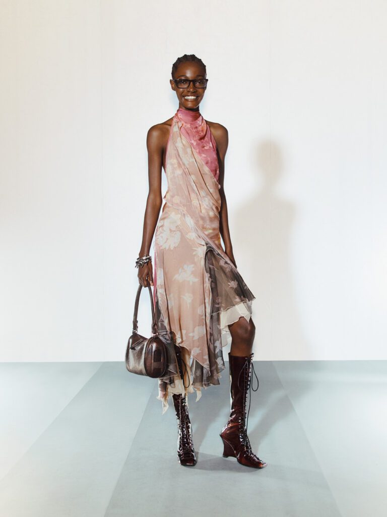 Ultimately, the focus is on the clothes themselves. A bonded faux-leather, collarless cocoon-sleeve jacket stands out for its precise cut, while an aged leather biker jacket already feels well lived-in. Acetate double-breasted tailoring balances sharpness with ease. Solarised floral prints glow across trompe l’oeil wrap dresses and tops, while washed seersucker pants, skirts, and double-layer dresses feel destined to become long-term favourites.