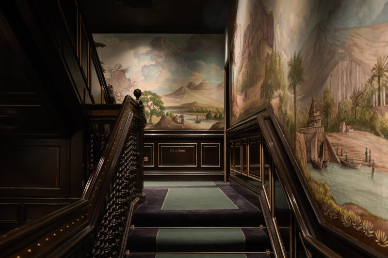 From the first step, everything screams decadence and glamour, at 100 Princes Street, more is more, and I love how entirely unapologetic it is. The interiors are dark and dramatic, with heavy bannisters and hand-painted wallpapers that stretch all the way up a five-story staircase. The colourful murals depict stories of Scottish explorers and botanists during their adventures, featuring big waterfalls and leafy backdrops that imitate the style of old Victorian paintings.