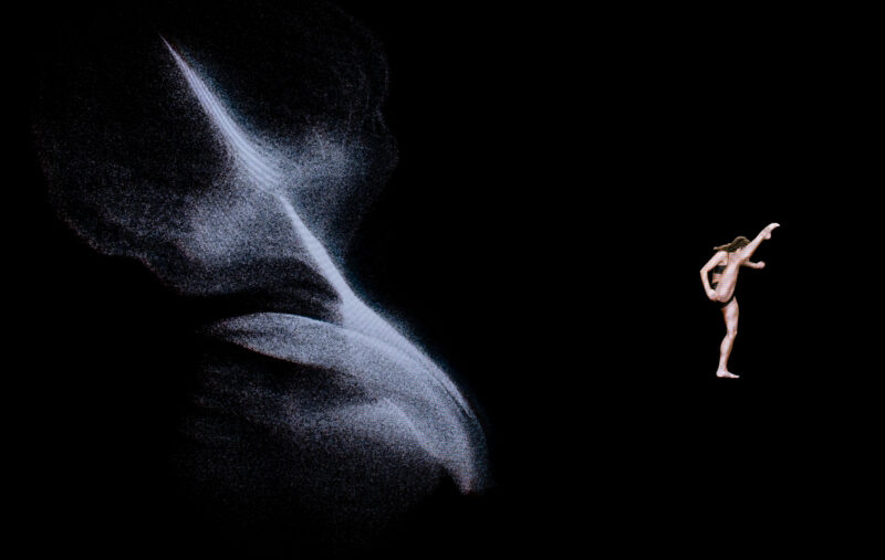 Set within Jeffrey Shaw and Sarah Kenderdine’s towering architectural structure—eight meters wide and four meters tall—and projected onto a 26-million-pixel, three-dimensional screen, the piece combines choreography, digital imaging, and artificial intelligence.