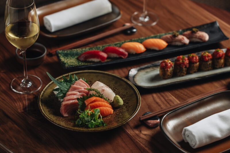 The menu, guided by the team behind Dubai’s acclaimed Mimi Kakushi, continues this intercultural dialogue. Japanese ingredients meet French-trained precision, resulting in dishes that are both grounded in tradition and subtly reimagined. We begin with steaming edamame and comforting miso soup before diving into the restaurant’s exceptional raw selection of bluefin fatty toro sashimi, A5 wagyu nigiri with caviar, otoro nigiri with caviar, and the citrus-bright yuzukosho hamachi. Each bite feels like a quiet study in balance and restraint.