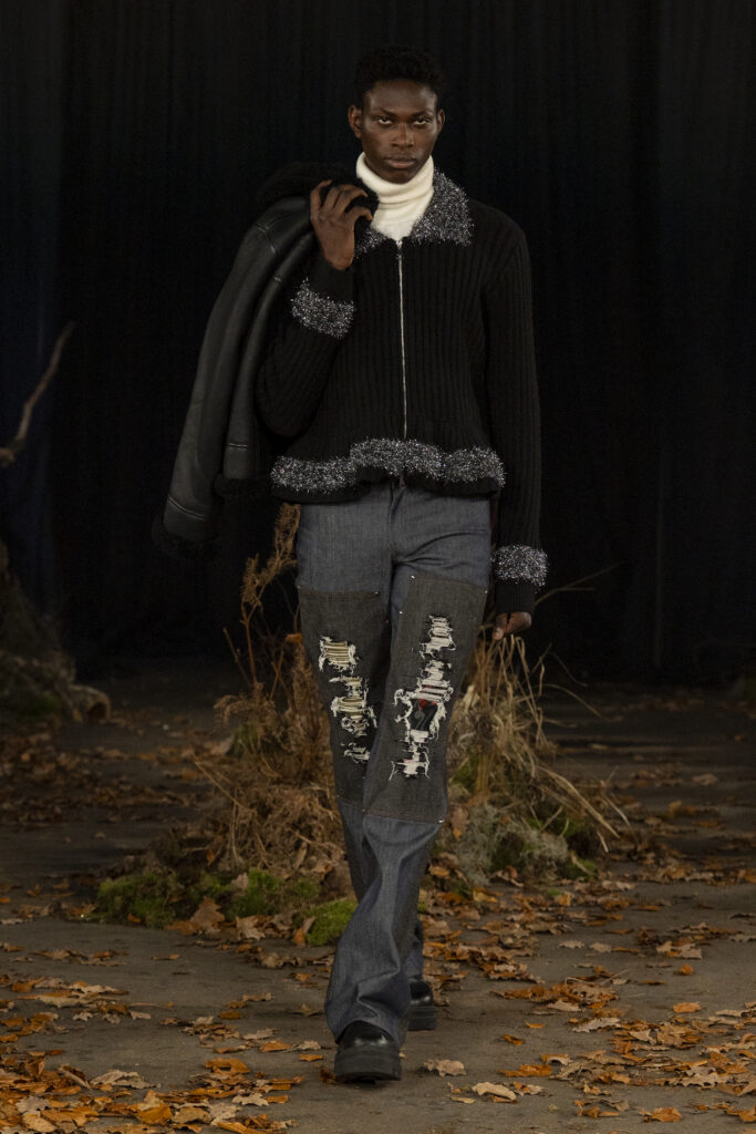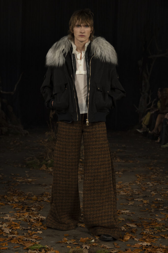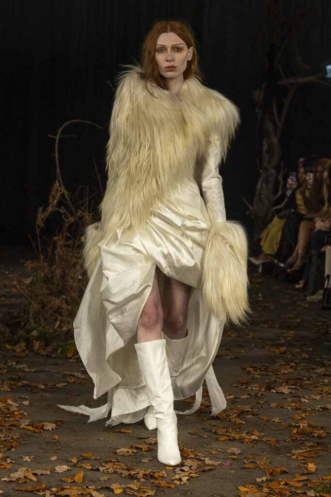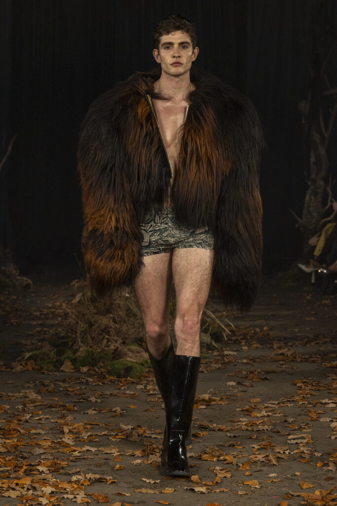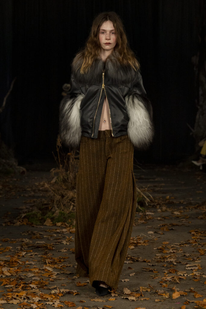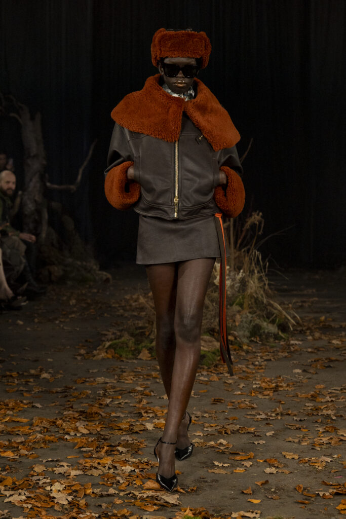 Imagine Little Red Riding Hood rewritten in her own hand. In this telling, she does not wait to be rescued; she kills the wolf, skins him and transforms the threat into a trophy. Icelandic sheepskin becomes exquisite trims, and the leather aviator layers are tailored into sharp coats cut close to the body. Following her is a hunter who is less saviour and more accomplice in the tailored sets that follow, their chemistry charged and conspiratorial. The romance is feral and deliberate, a study in power reclaimed and worn with intention.