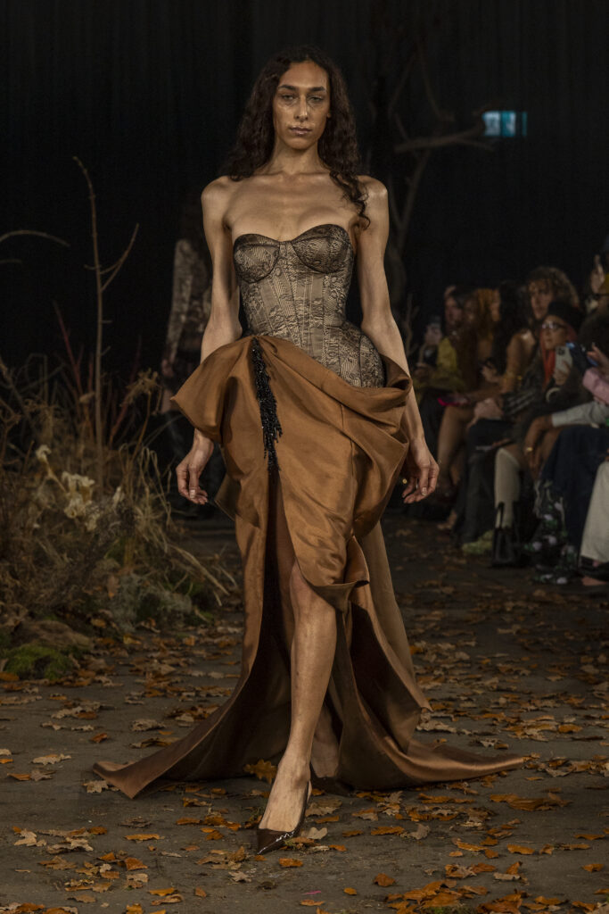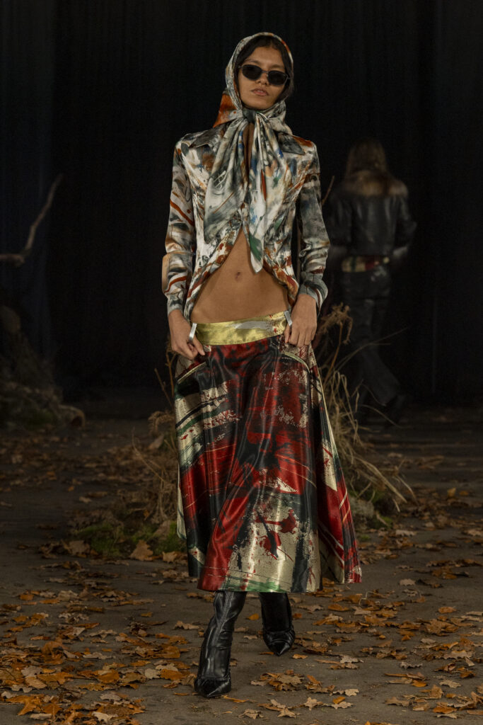 Throughout the collection, bold prints remained a key marker of the brand’s biggest ode to individuality. It is true that these silk tartan torn prints take someone who is bold and a force within their own individuality. Bold silhouettes and padded hips, some of which protrude outwards with dramatic force, garner attention from all glancing eyes. These shapes command attention and celebrate confidence within the wearer. The garments invite movement and presence, allowing the person wearing them to occupy space with mythical silence.
