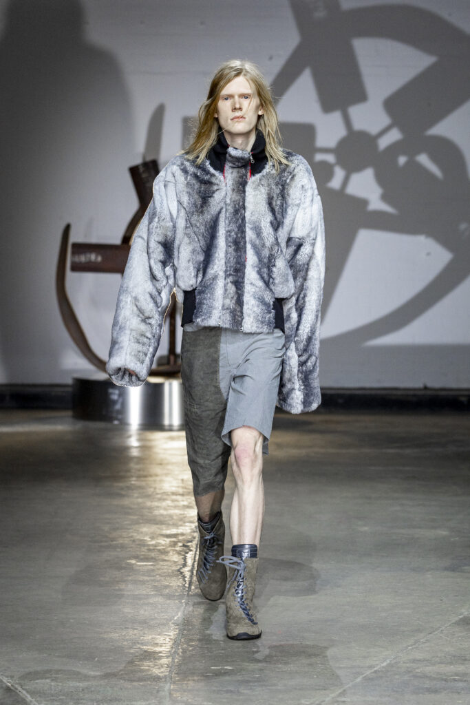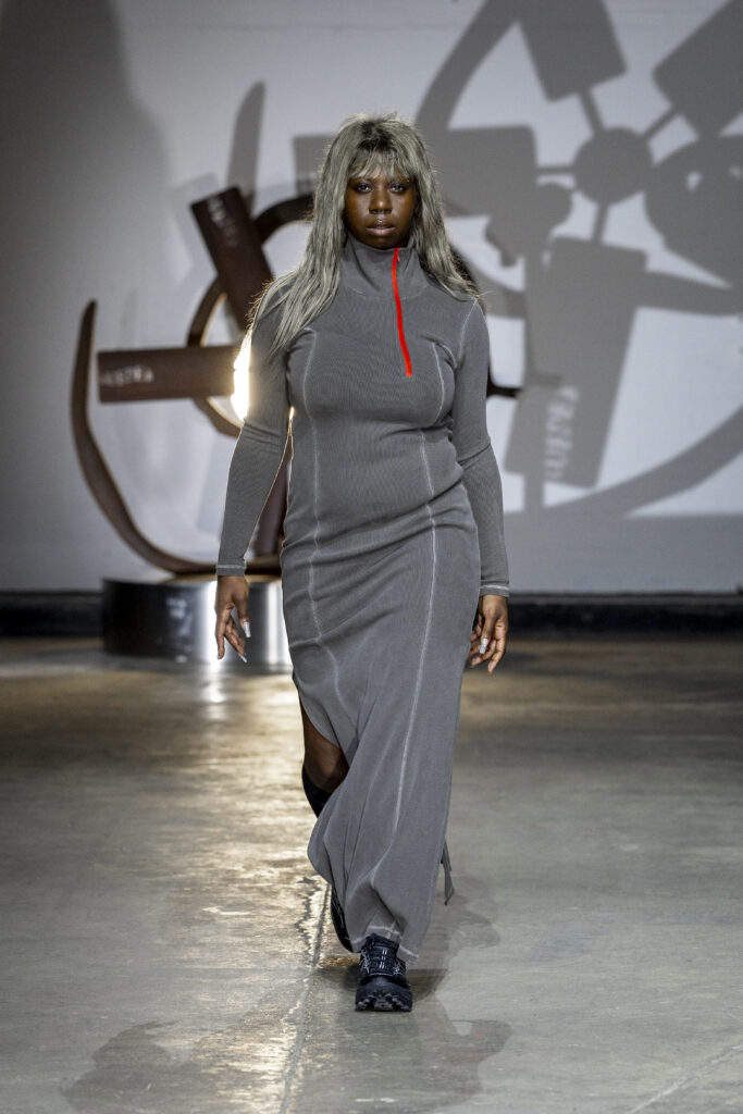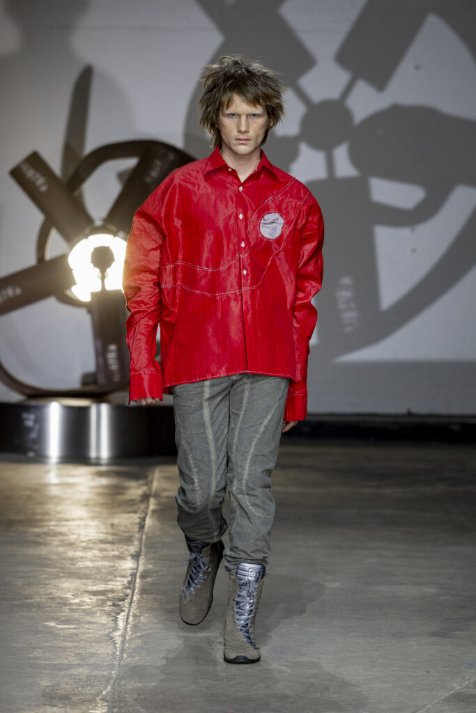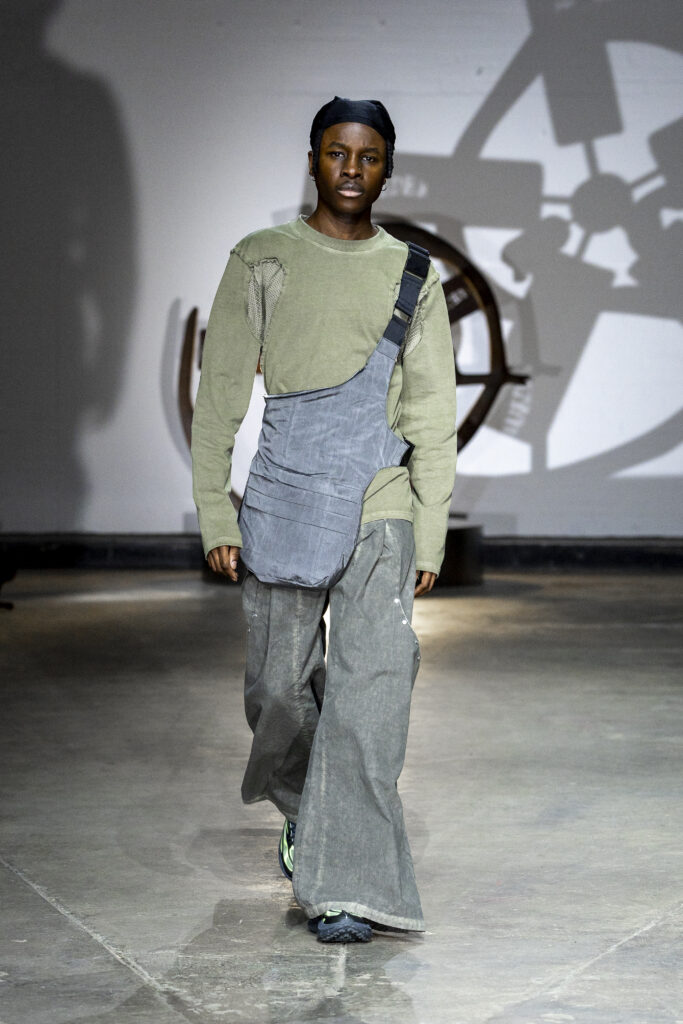 Grey, blue and khaki dominated the colour palette, punctuated by occasional flashes of bright red. Headwear was a defining motif, with hoods and reworked balaclavas adding a protective, medieval feel to the looks. Footwear largely consisted of trainers, alongside chunky boots and black high heels, blending street style and theatricality.