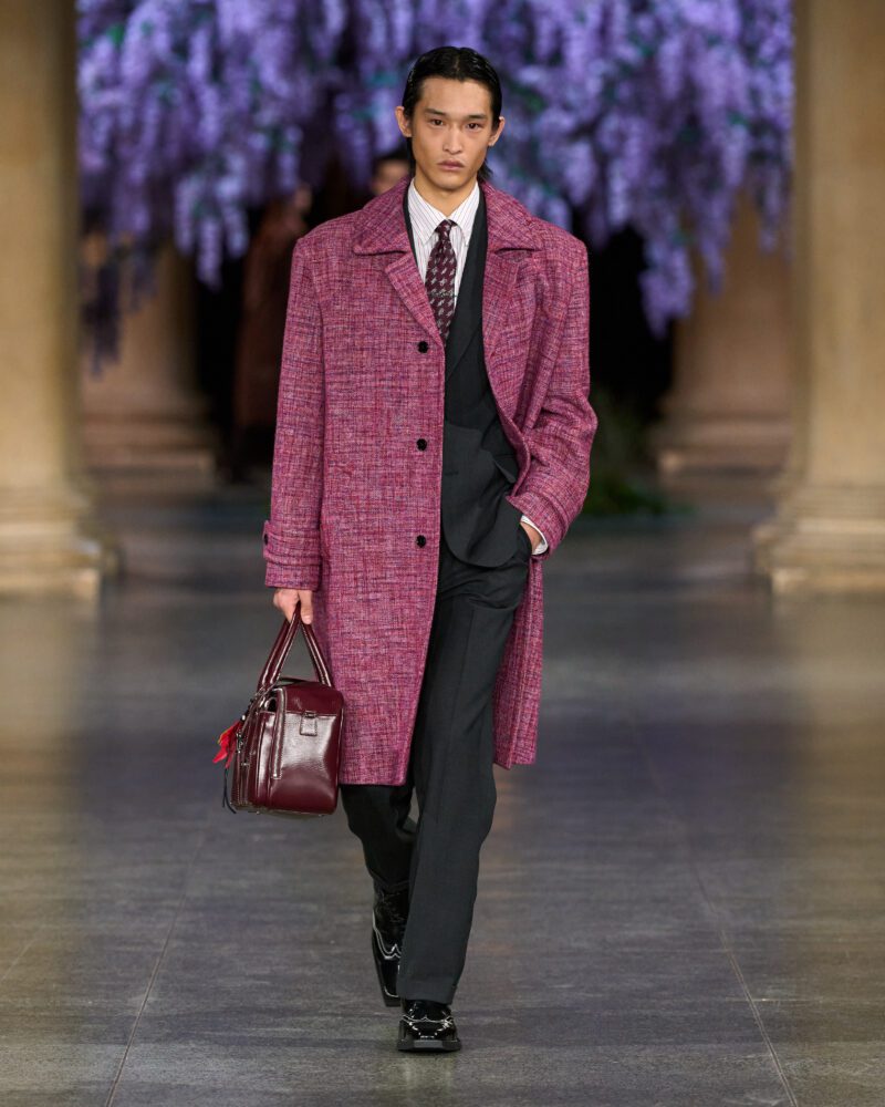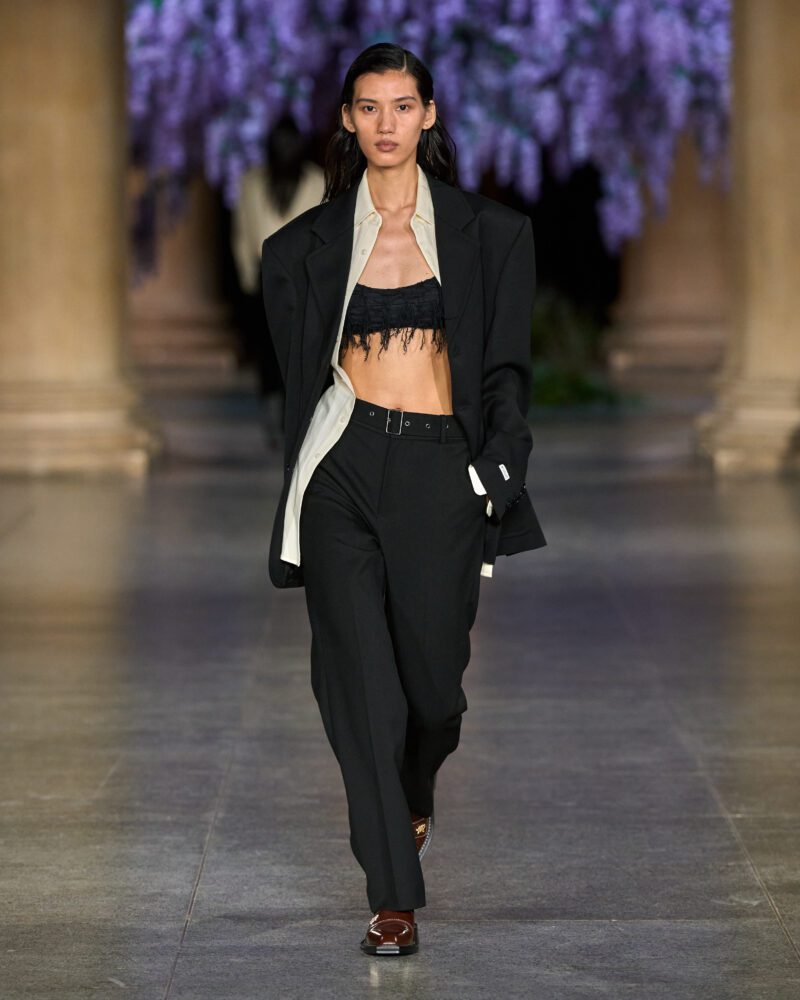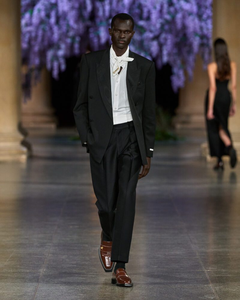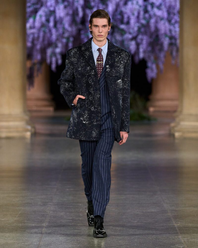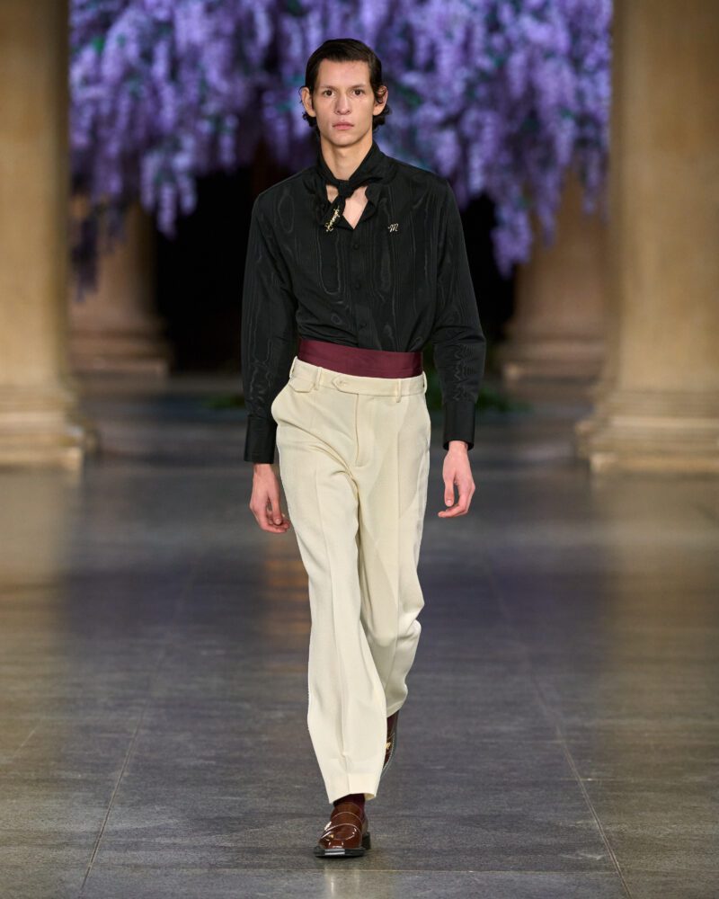 But Fletcher refracted these codes through a contemporary lens, layering them with risqué energy and fluidity. Shirts were left unbuttoned with a rakish ease, trousers rode slightly low, and structured coats opened to reveal intoxicating contrast beneath – a nod to debauched elegance rather than mere tradition.