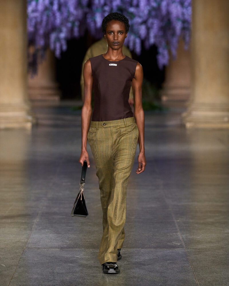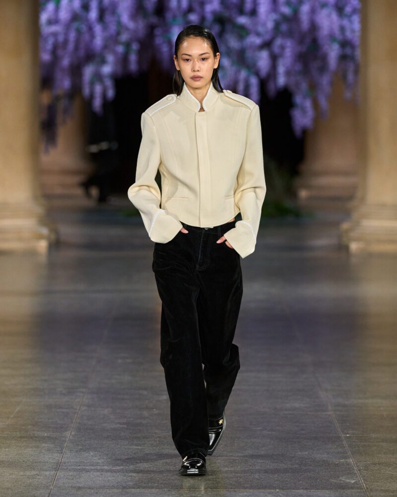 Where some LFW runways this season emphasised spectacle, Mithridate’s AW26 collection found its power in storytelling. The narrative of wisteria – a plant carried from Guangzhou to Britain and now thriving – became a metaphor for Fletcher’s own cultural fluency. As models moved, the collection looked like a journey: from riverside regattas and hunting cottages into urban nights that spark as dusk falls. This blend of heritage and hedonism was punctuated with accessories that turned utilitarian pieces into statements: think oversized carry-alls, brooch-like tokens and layered knitwear that nodded to both function and fantasy.