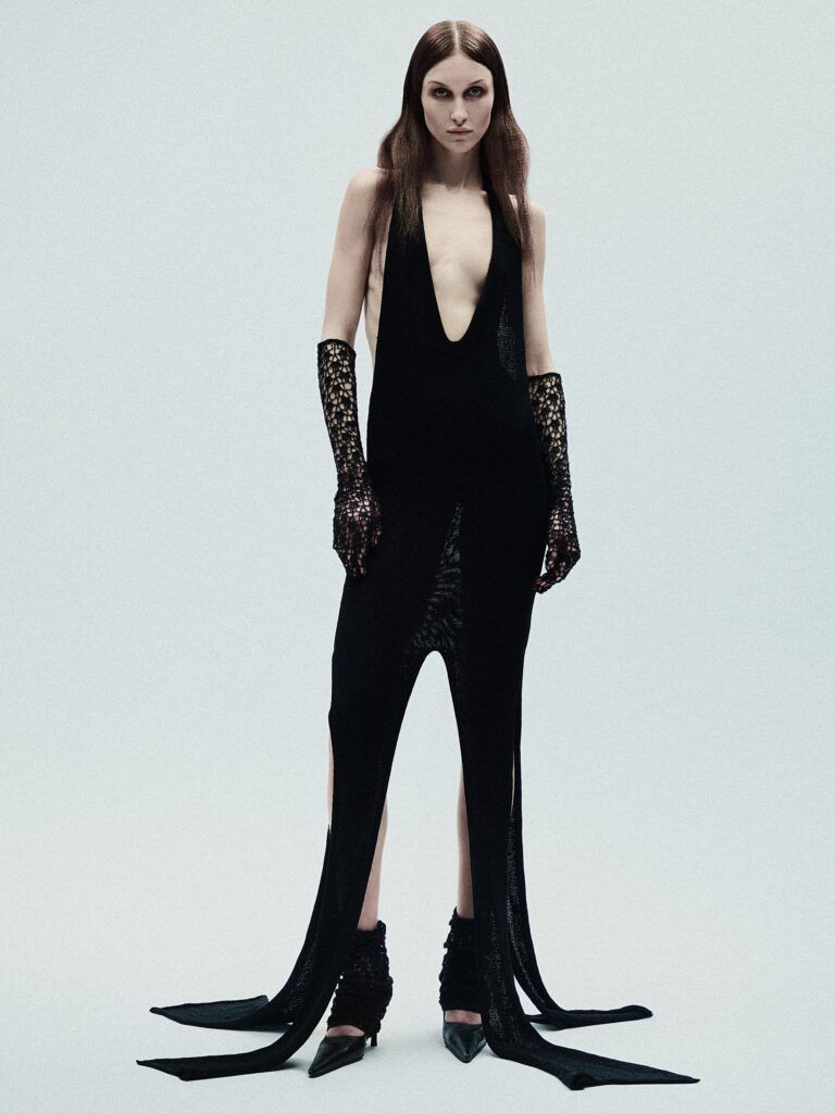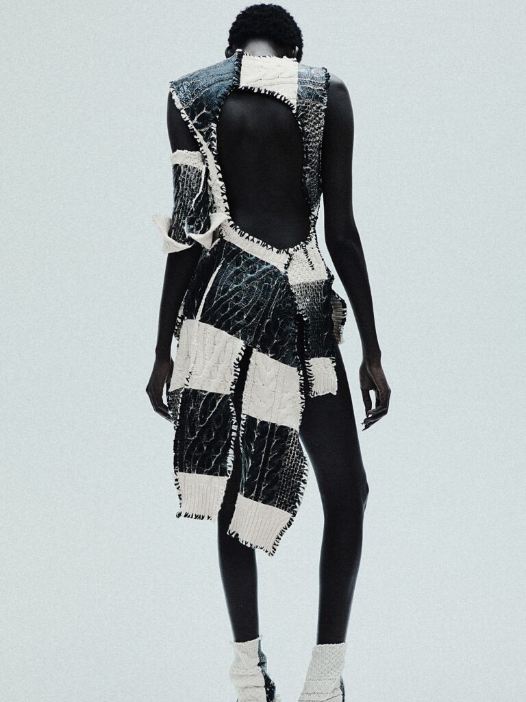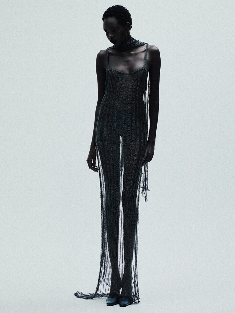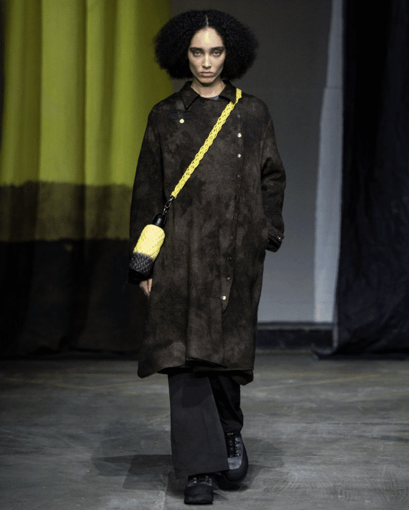 Titled Devotion, RAQUEL DE CARVALHO’s AW26 collection treated knitting and crochet as ritual, transforming vintage wool jumpers, deadstock yarns and off-cuts of sheepskin into asymmetric knits and reworked Aran silhouettes. Delicate lace and experimental constructions balanced sensuality and strength, while a commitment to repurposed materials reinforced the brand’s commitment to responsible production.