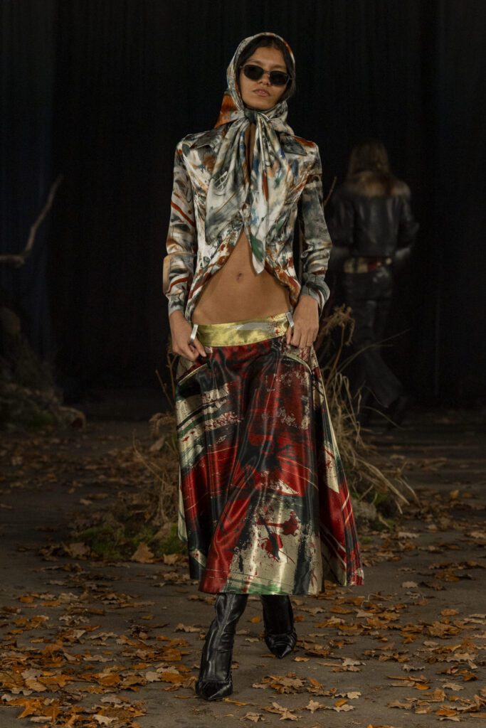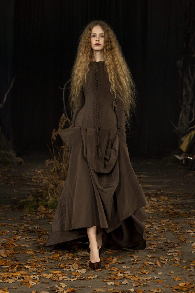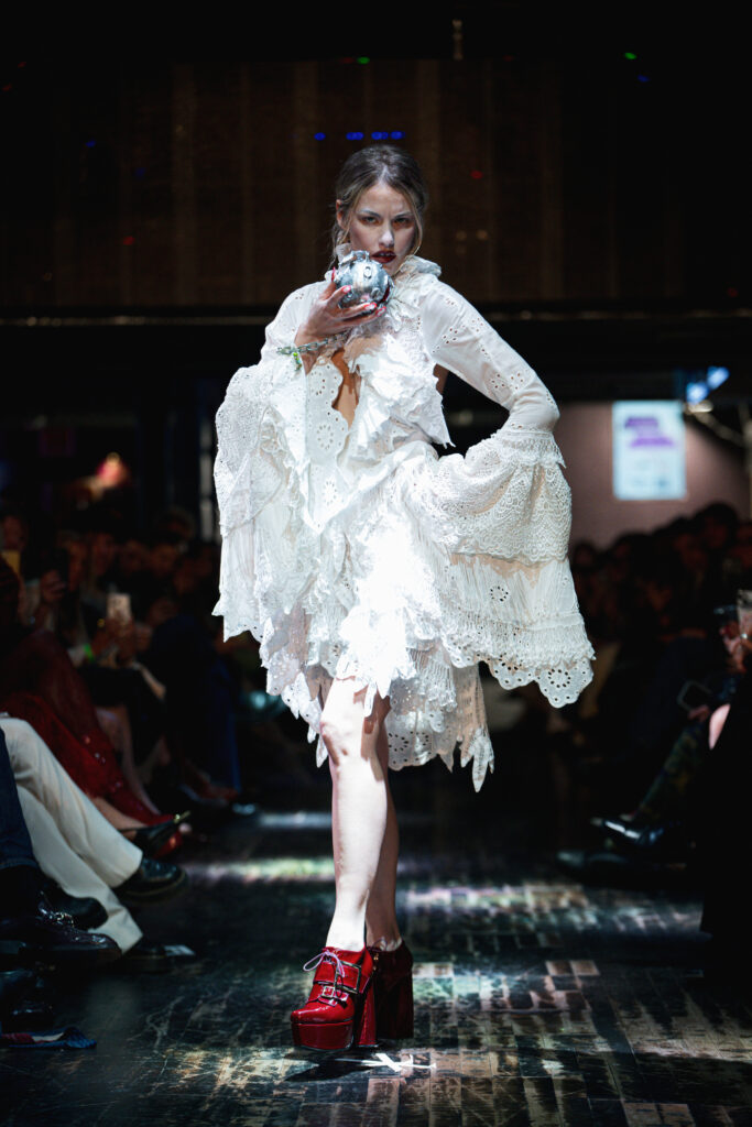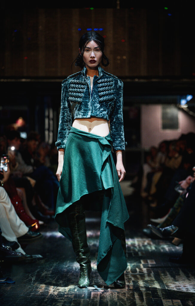 Hector Maclean’s Escape was a tribute to his Polish grandmother, who was displaced during the Second World War, her life shaped by love, loss and resistance. Military-style tailoring met delicate Scottish lace and Polish detailing, creating a dialogue between strength and femininity. Sustainability remained central, with deadstock fabrics repurposed into structured pleats and draped forms.