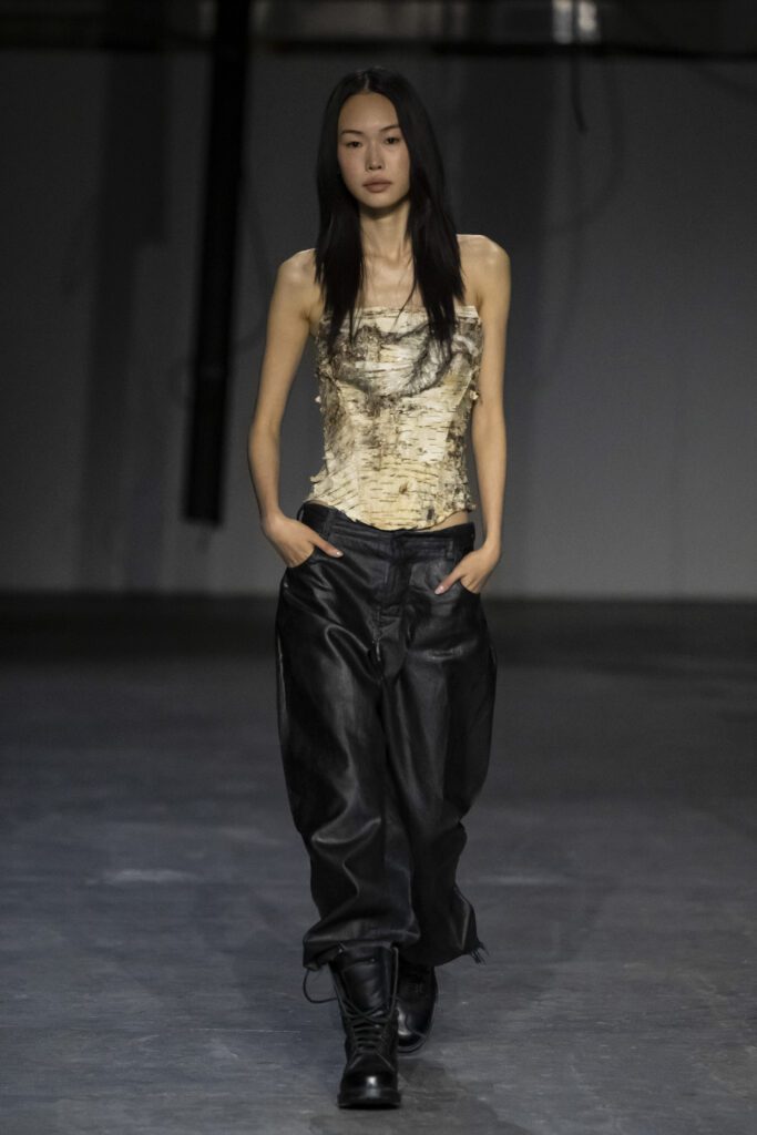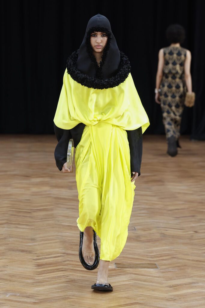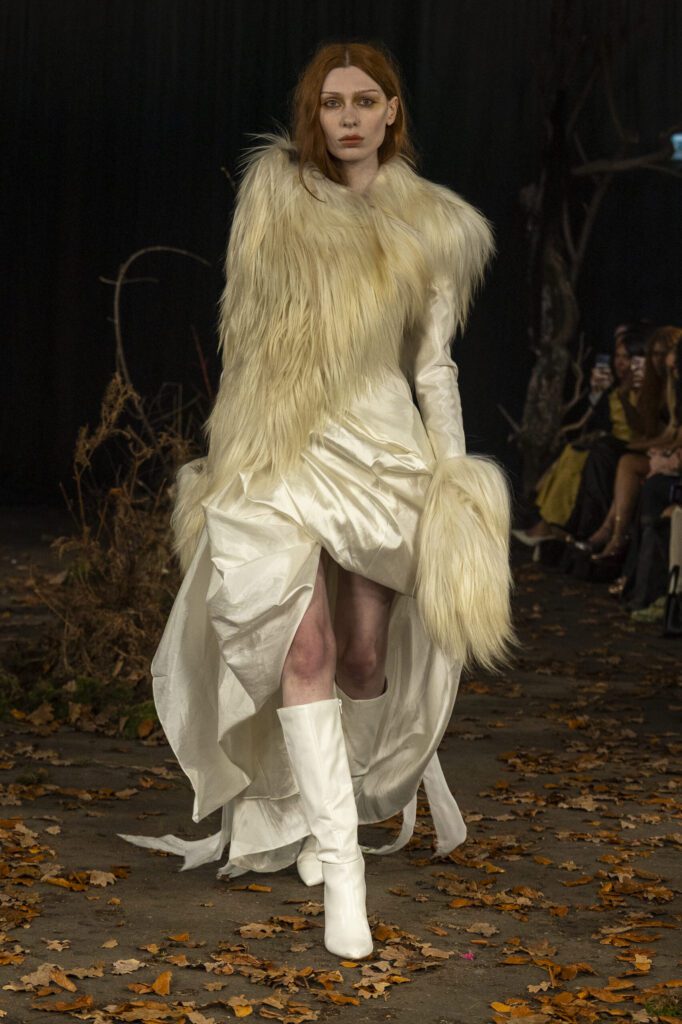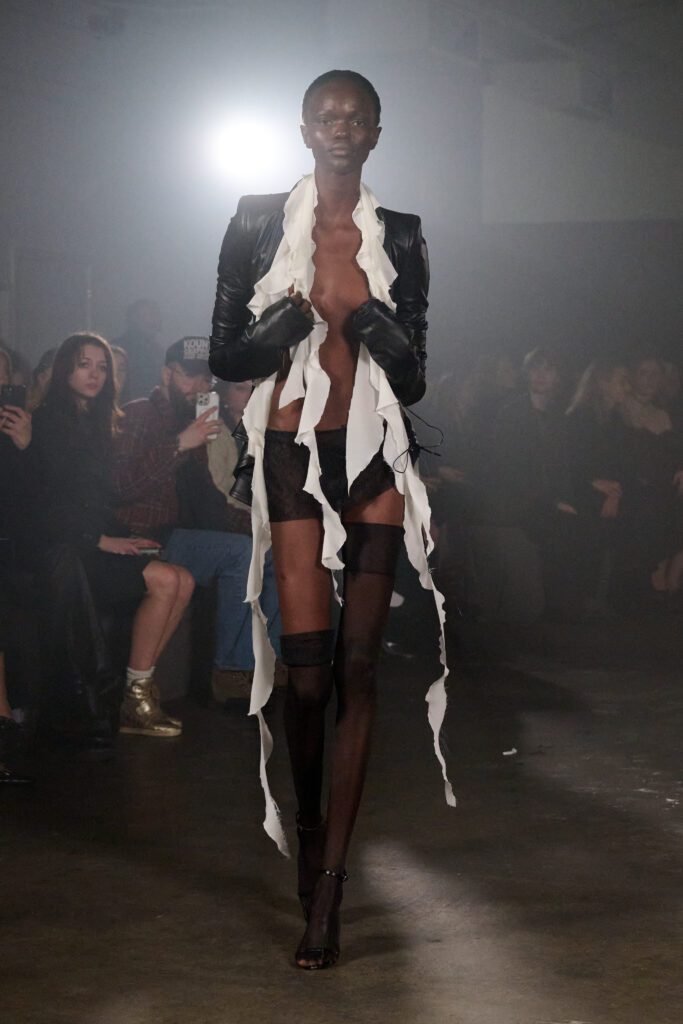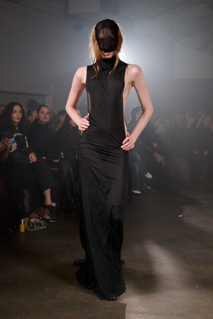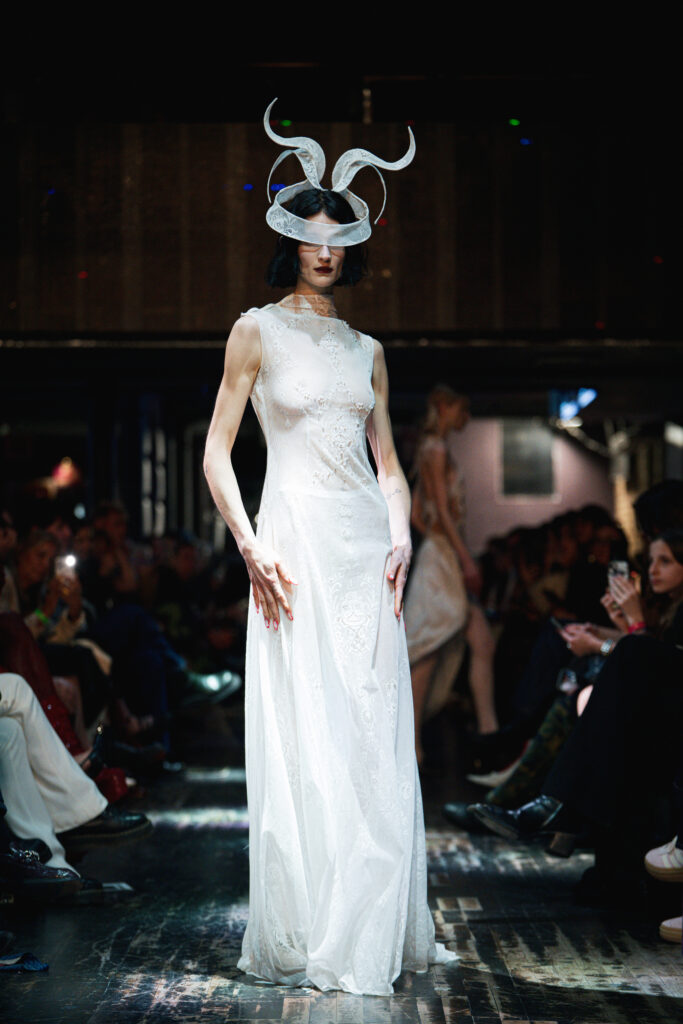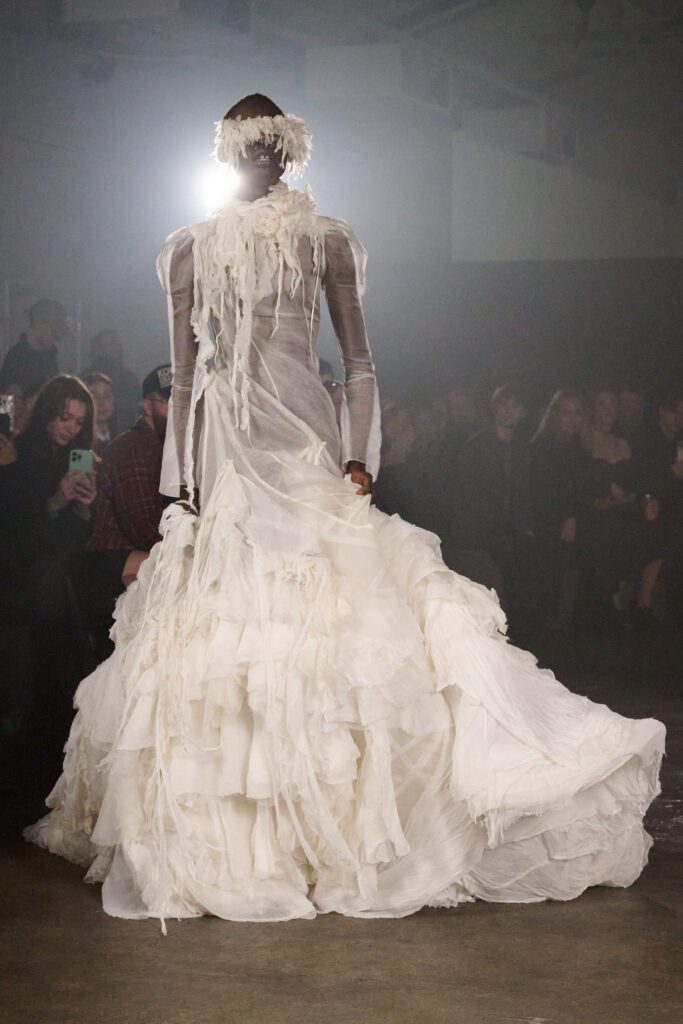 MYAT’s AW26 collection, Antechamber, explored the tension between concealment and self-revelation through an immersive, performance-led show. Staged in an East London warehouse, models circled a fractured sugar-glass box that enclosed a figure in a white feathered dress, who eventually broke free to close the presentation. The collection moved from protective dark silhouettes to lighter, translucent layers, reflecting a journey from entrapment to freedom.