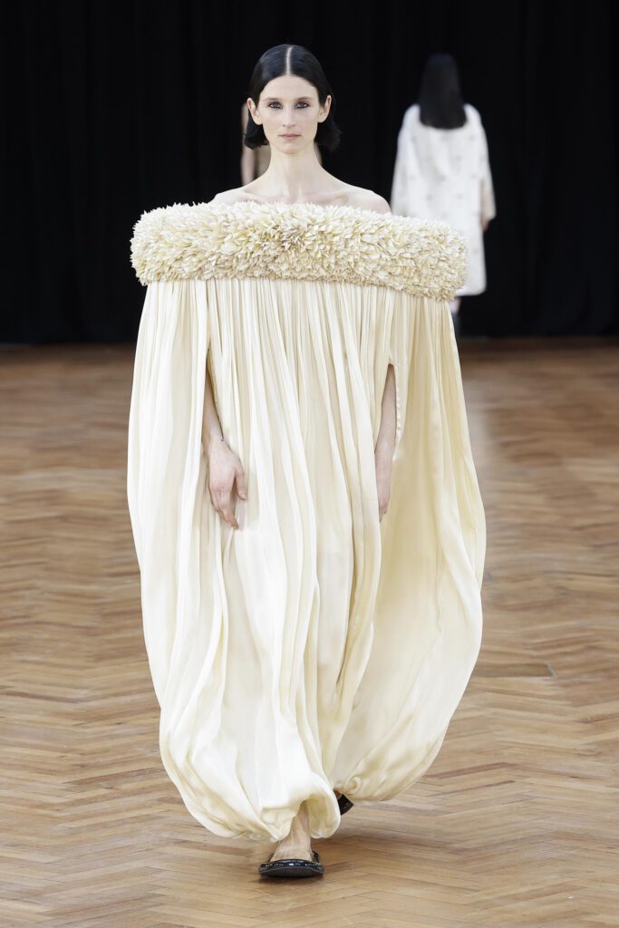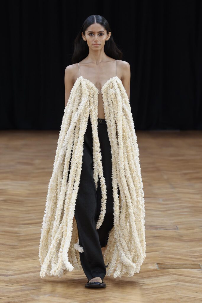Marking its London Fashion Week debut, Raw Mango turned traditional Indian craft into runway architecture, with laser-cut silk floral collars, circling waists and trailing hems that reimagined garlands for the catwalk. Founder Sanjay Garg drew on handloom and embroidery techniques from Rajasthan, Madhya Pradesh, West Bengal and Varanasi, translating centuries-old textiles into sharp contemporary silhouettes.