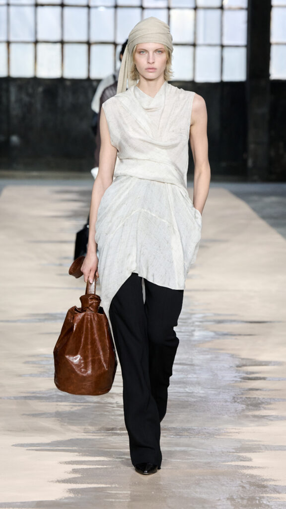 If cut is one measure of a designer’s skill, then the airy, elegant proposals of Marco Falcioni’s design codes are sure to become one of the most promising new ones in Italian fashion. His perfectly tailored trousers—earthy and roomy—could become cult buys.