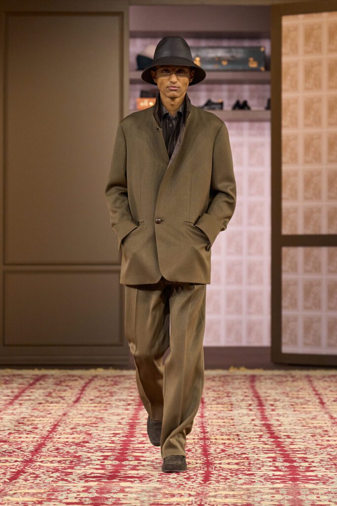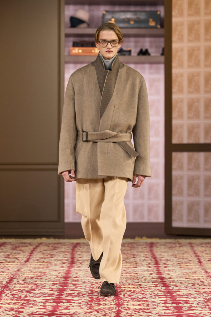 For Zegna’s AW collection, he continued to pursue that personal obsession, but strengthened it by incorporating influences from the house’s generational codes. That meant using retro suiting fabrics to make baggy, textured pants, and replacing the formal coat with breezier variations of toppers and outerwear.