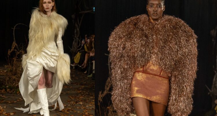 A series of textured knits in autumnal colours ensued, with each outfit playing with colour panelling and gradients. The show closed with a return to monochromatic black and white, heightened by the contrast between sheer, pleated, ruffled and furry knit panels. Standout pieces included monochromatic pleated knit dresses, and a sleeveless turtleneck tunic and matching skirt in a masterful combination of colours and textures.