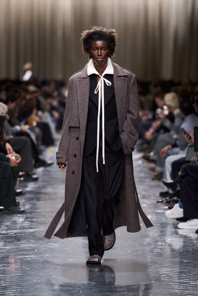 Historical references ran quietly beneath the surface. There were echoes of early 20th-century modernism, bringing forward bohemian aristocracy where men dressed with cultivated nonchalance rather than sturdy rules. Lavallière-style shirts, textured knits, ornate waistcoats, and fringe details suggested a wardrobe built around personality rather than uniformity.
