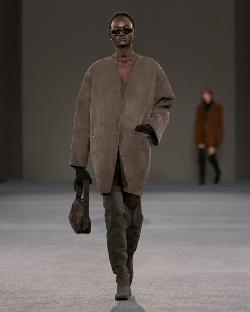 Standouts included flat suede boots, with the material extending beyond detailing into full looks, such as a three-piece suit and a cashmere curve coat to match. “I really wanted to re-emphasise the coat as the fulcrum of this collection, and therefore the suit took a passenger seat.”