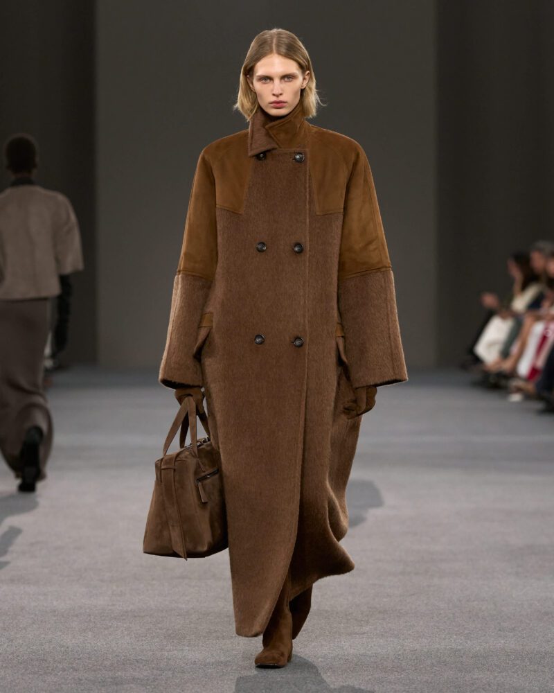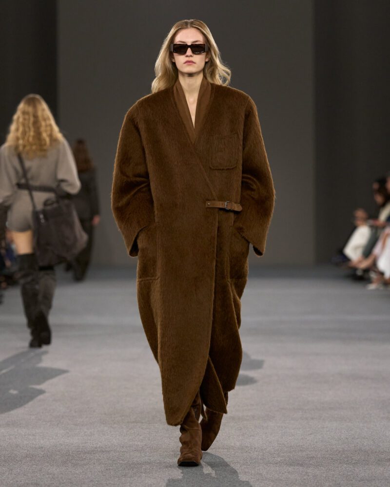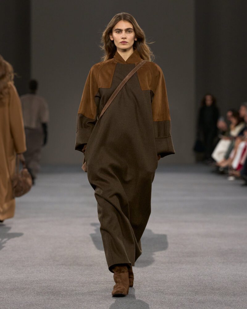Ian Griffiths’ vision is a case in point. “I leave it to you to make any parallels you wish between the Dark Ages then and the Dark Ages now,” Max Mara’s Griffiths told reporters backstage after the show. “The whole thing started with a trip to Suffolk, where I was struck by the beauty of artefacts made in the so-called Dark Ages. I was thinking about objects that grow more beautiful with time, the more they’re used. Which, of course, led me to Max Mara coats, because they are life companions.”