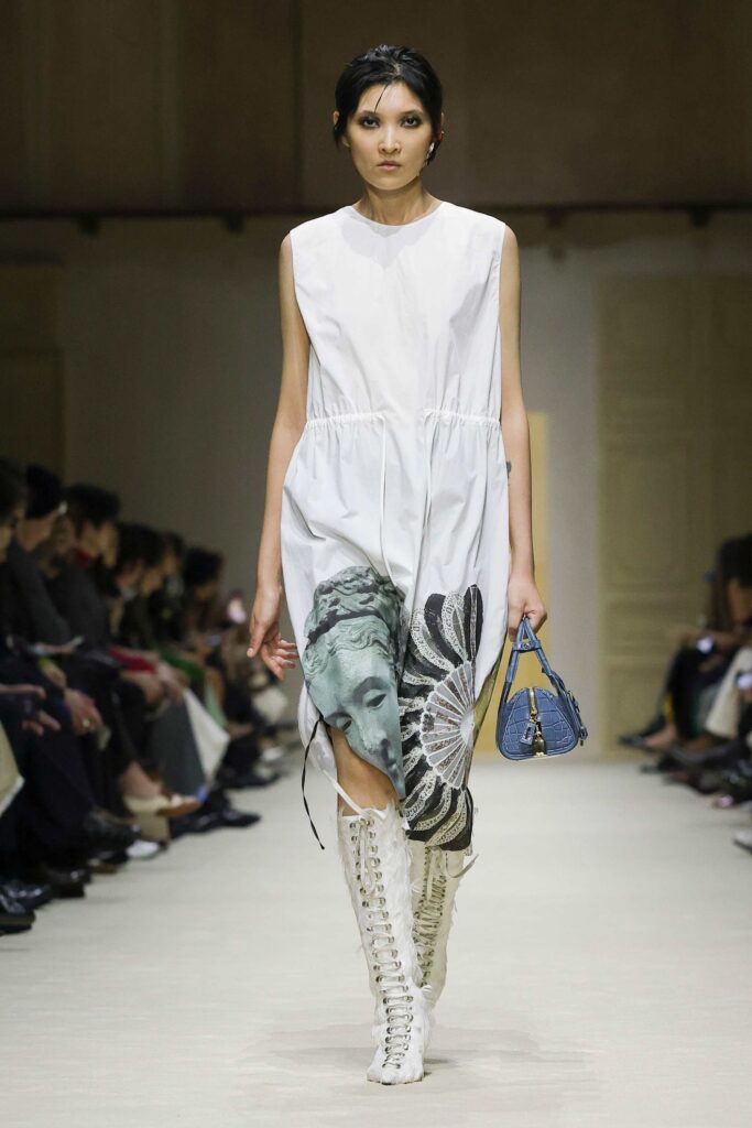 From the late medieval period, Griffiths leapt to Italy, citing Matilde di Canossa as a key inspiration, one of the most charismatic and powerful figures in Italian history, long before feminism was even conceived, and therefore, thoroughly deserving of her place in the Max Mara pantheon, he argued. “The great thing about Matilde was that she was said to have been as wise as a serpent and as graceful as a dove.”