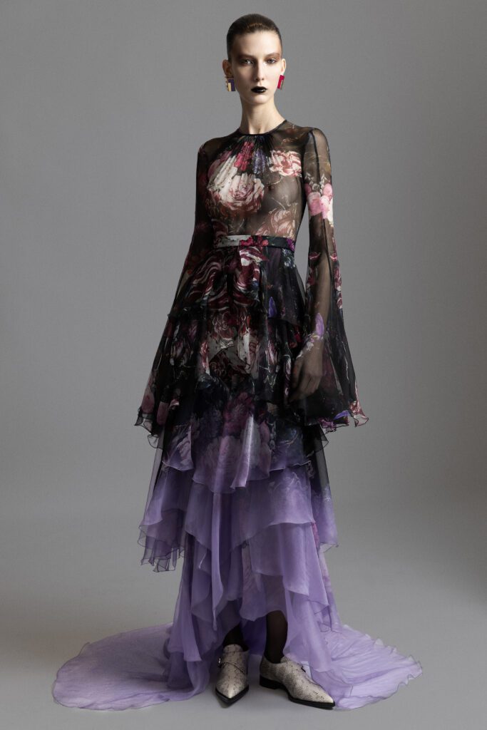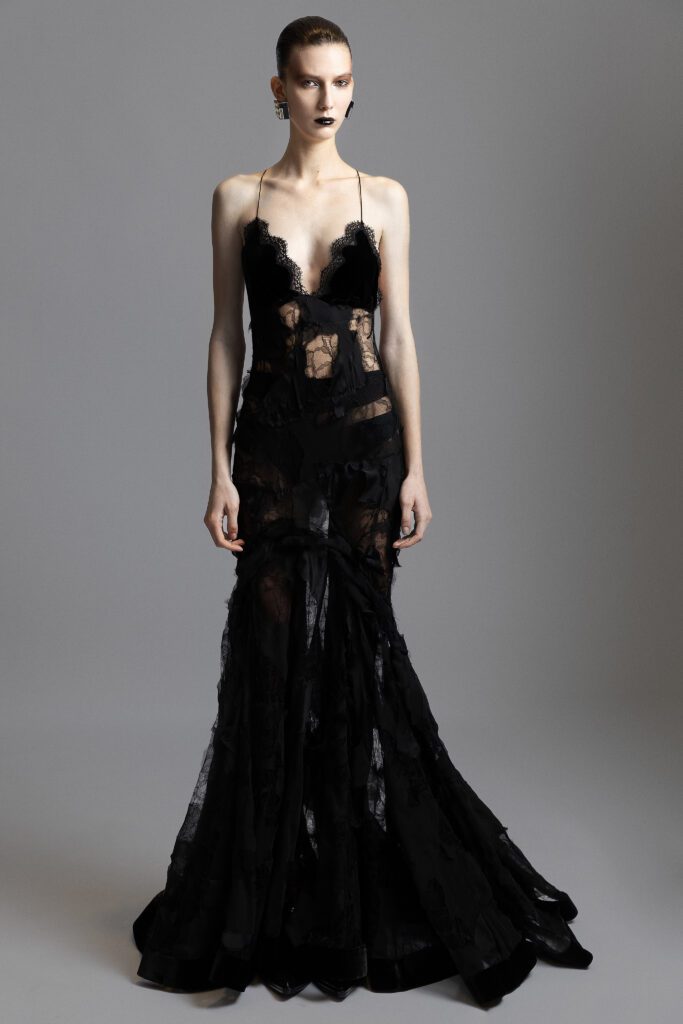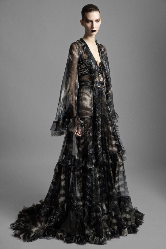 Roberto Cavalli turned to black as its primary hue this season, infusing the collection with a surge of unabashed femininity: from crocodile jacquard sculpting sharp jackets to trousers with graphic detailing. At the heart of the lineup, Fausto Puglisi’s signatures came to the fore with bold intent: A-line skirts structured with crinolines to amplify the silhouette, gladiator dresses cut to sculpt the body, and sharply defined shirt-dresses.